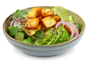Välj protein : Falafel, Friterad halloumi, Handskalade räkor, Kycklingfilé
